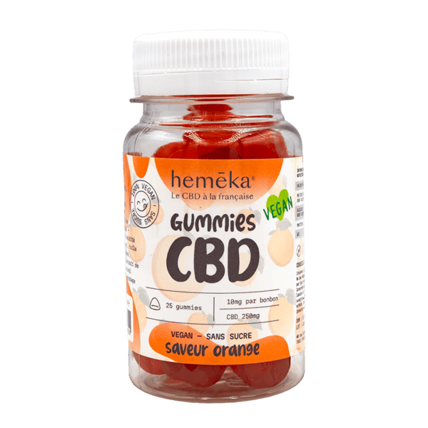 Édulcorants (maltitol, sorbitol), eau purifiée, gélifiant (pectine), acidifiant (acide citrique), extrait de chanvre (CBD), régulateur d’acidité (citrate trisodique), huiles végétales (coco, palme), colorant naturel (extrait de paprika), arôme naturel d’orange, agent d’enrobage (cire de carnauba).